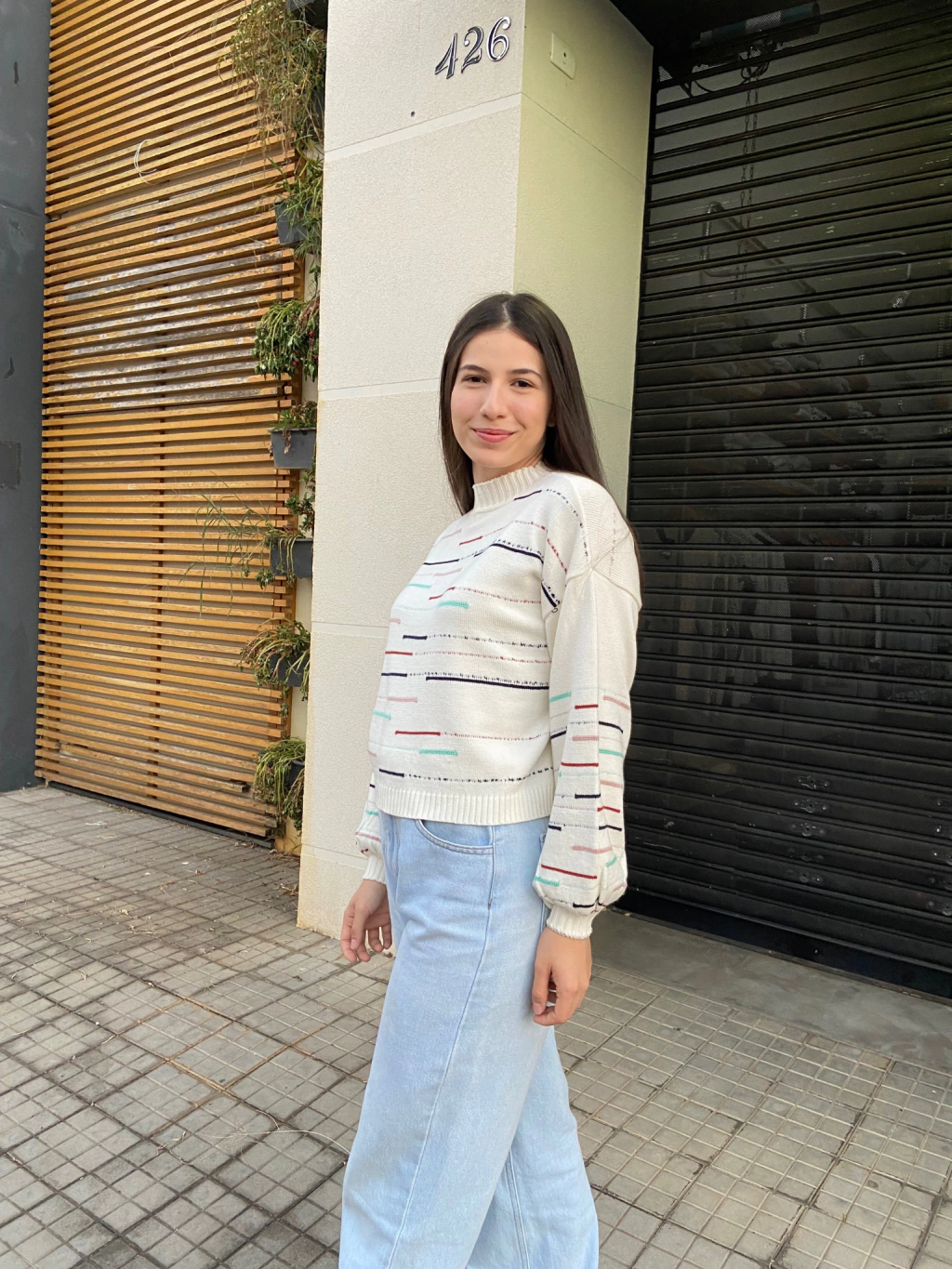 Design: Cava deslocada, modelagem levemente oversized com shape boxy. A padronagem em listras coloridas confere um visual contemporâneo, enquanto os punhos e barra canelados trazem acabamento impecável.