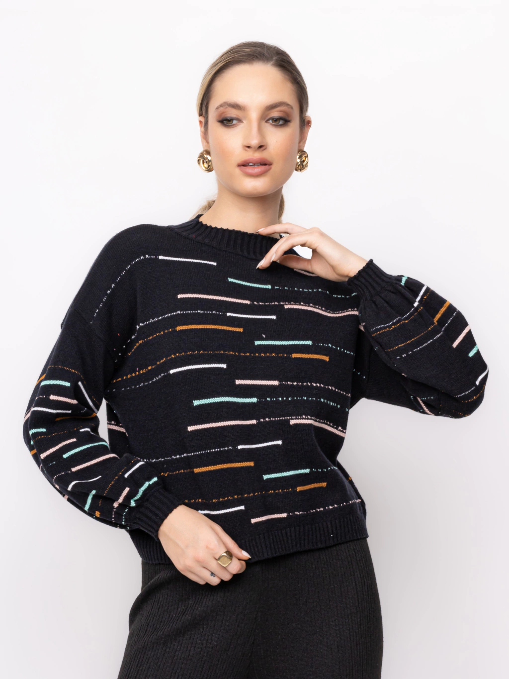 Design: Cava deslocada, modelagem levemente oversized com shape boxy. A padronagem em listras coloridas confere um visual contemporâneo, enquanto os punhos e barra canelados trazem acabamento impecável.