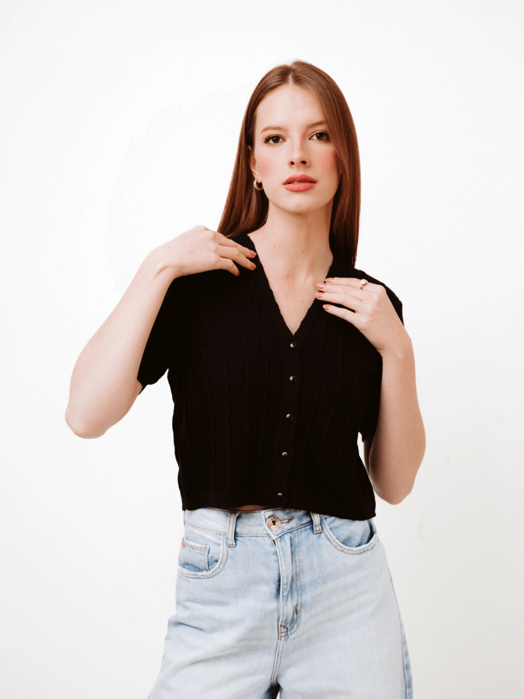 Camisa Cropped Canelada peça-chave que une estilo e sofisticação, perfeita para diversas ocasiões. Com medidas que garantem um ajuste impecável, esta camisa se destaca pela sua versatilidade e elegância.
