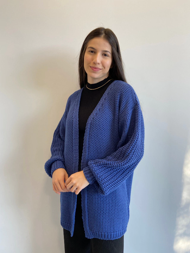 O Cardigã Tricot Blunas é uma peça confeccionada na lã, um fio de tricot que proporciona um toque suave e agradável. Sua modelagem mais ampla e longa nos envolve como um abraço aconchegante. A peça se adapta perfeitamente a todos os tipos de corpo, do P ao GG, e é ideal tanto para todas as mulheres. Este cardigã é extremamente versátil e atemporal, capaz de adicionar estilo aos seus looks e ainda mantê-la aquecida.