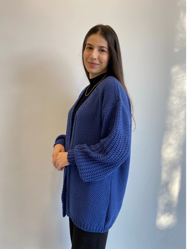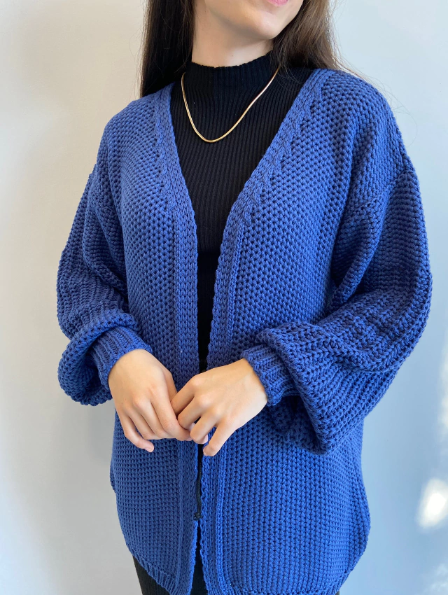 Trabalhado em pontos clássicos do tricot, com modelagem over, manga levemente bufante e punho na manga.