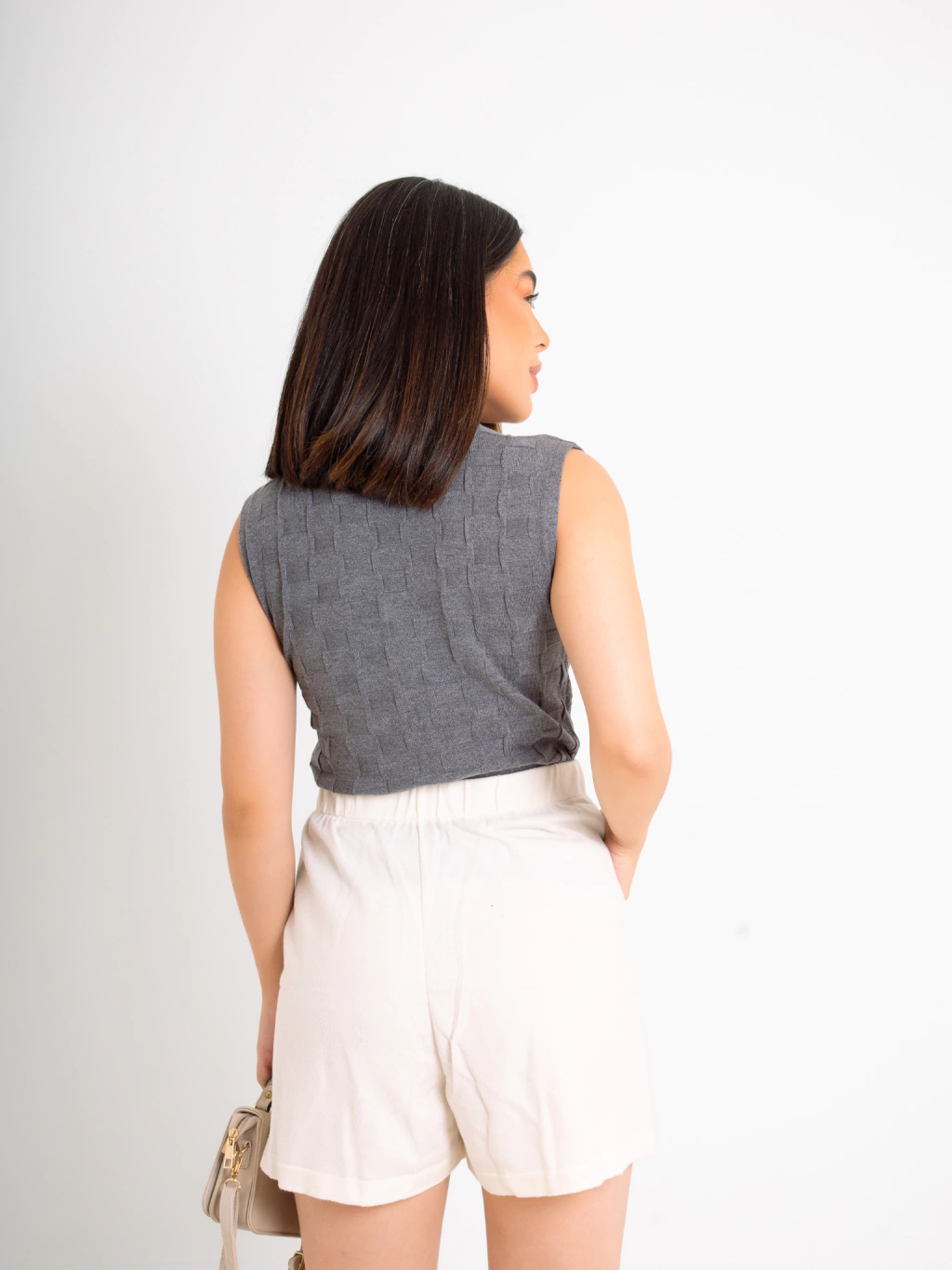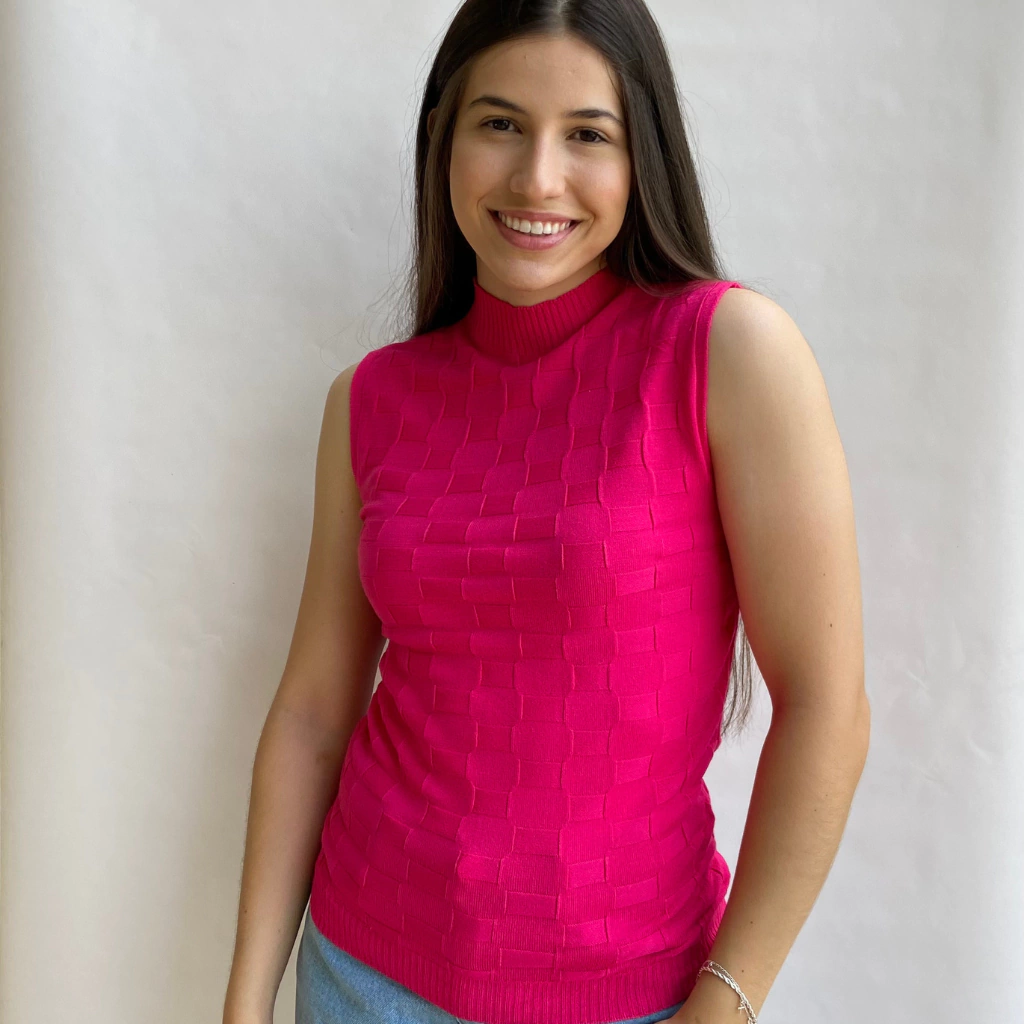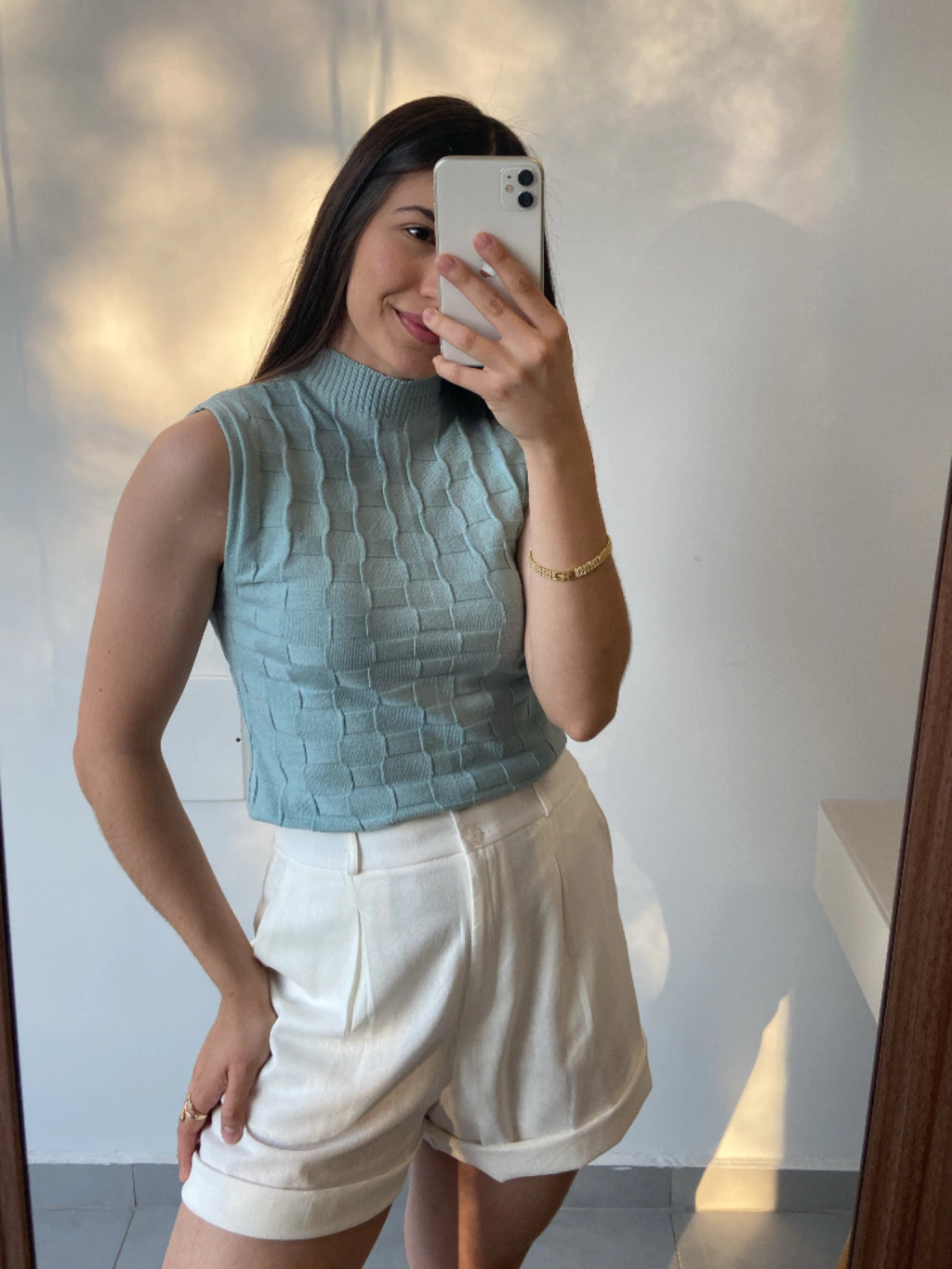 Regata texturizada com gola alta, que possuí detalhes canelados finos na barra e gola, o que torna a peça ainda mais delicada.